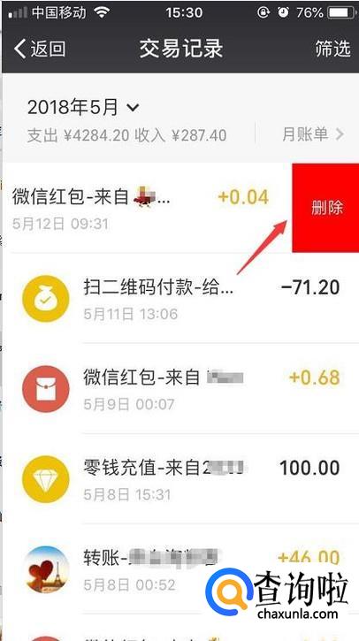 接着我们就可以看到微信上所有的支付记录了,想要删除哪个记录就把它向左滑一下然后点击删除即可。