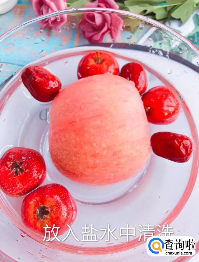 然后将山楂、红枣和苹果放入盐水中、反复搓洗干净,如下图所示。小贴士:盐水能够有效的去除食材中的农药残余。