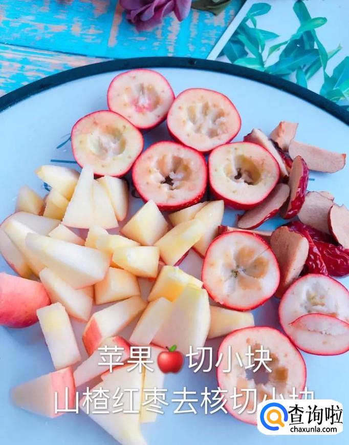 然后将苹果切成小块,山楂去核切成小块,红枣去核切成小块,如下图所示。