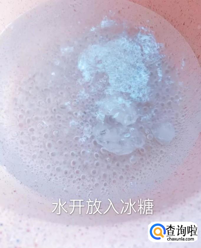 接着锅中放入适量的清水,待水烧开,加入老冰糖熬至冰糖完全融化,如下图所示。