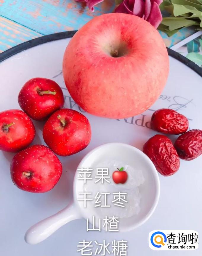 首先准备好所有要用到的食材,如下图所示。小贴士:苹果、干红枣、山楂、老冰糖。