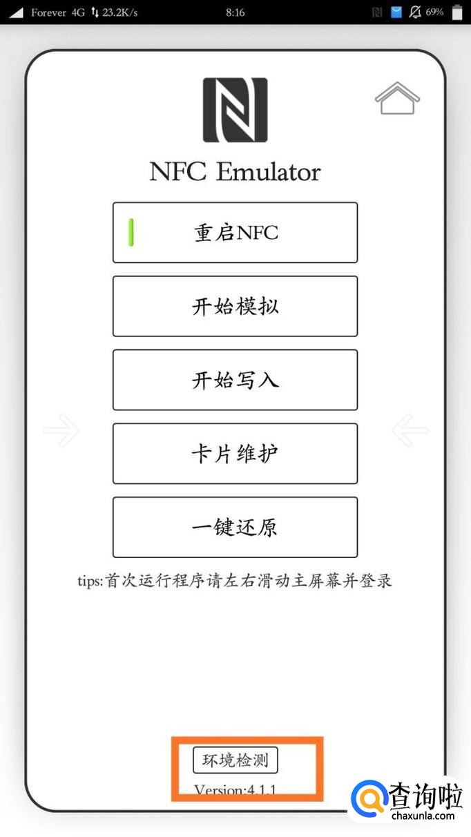 打开NFC模拟器,点击"环境检测",此步是解锁分区锁,过程可能重启,确定就行了。