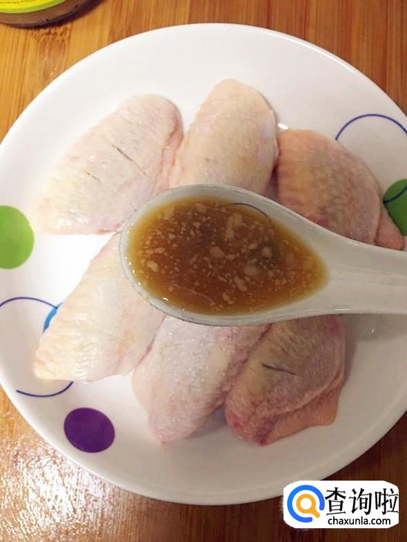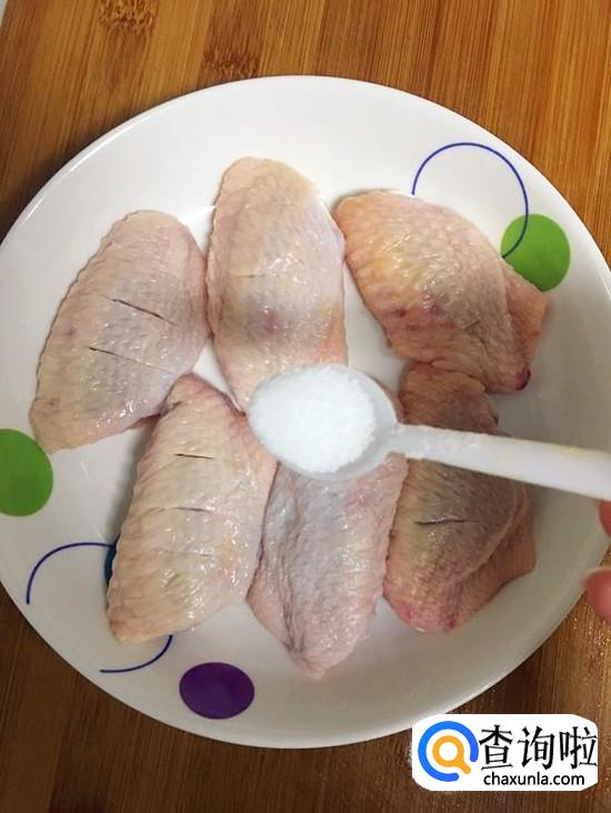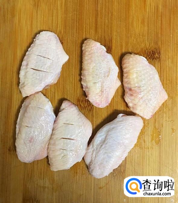 鸡翅用温水洗净后,抹干水分,正反面分别划上三刀,这样腌制的时候更易入味。