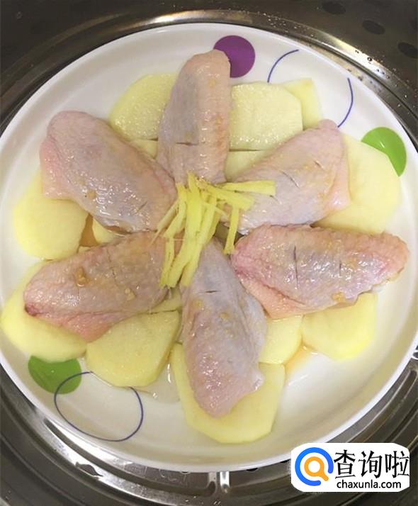 把腌制好的鸡翅捞出,摆放在土豆片上,再放上少许姜片,腌制鸡翅的调味料捞出其中的香葱,其余倒入盘中,然后放入蒸锅。