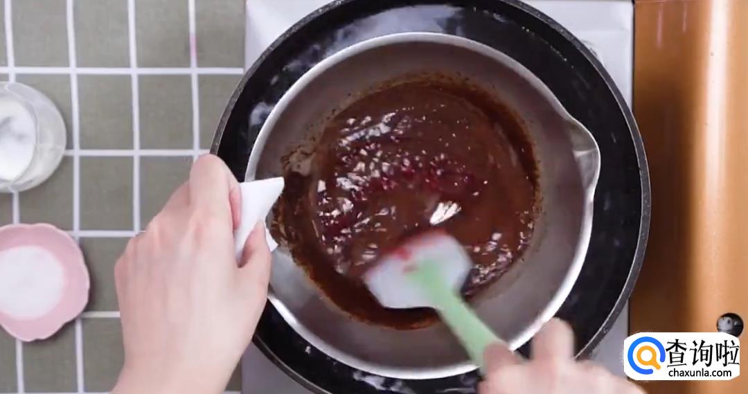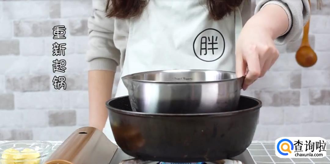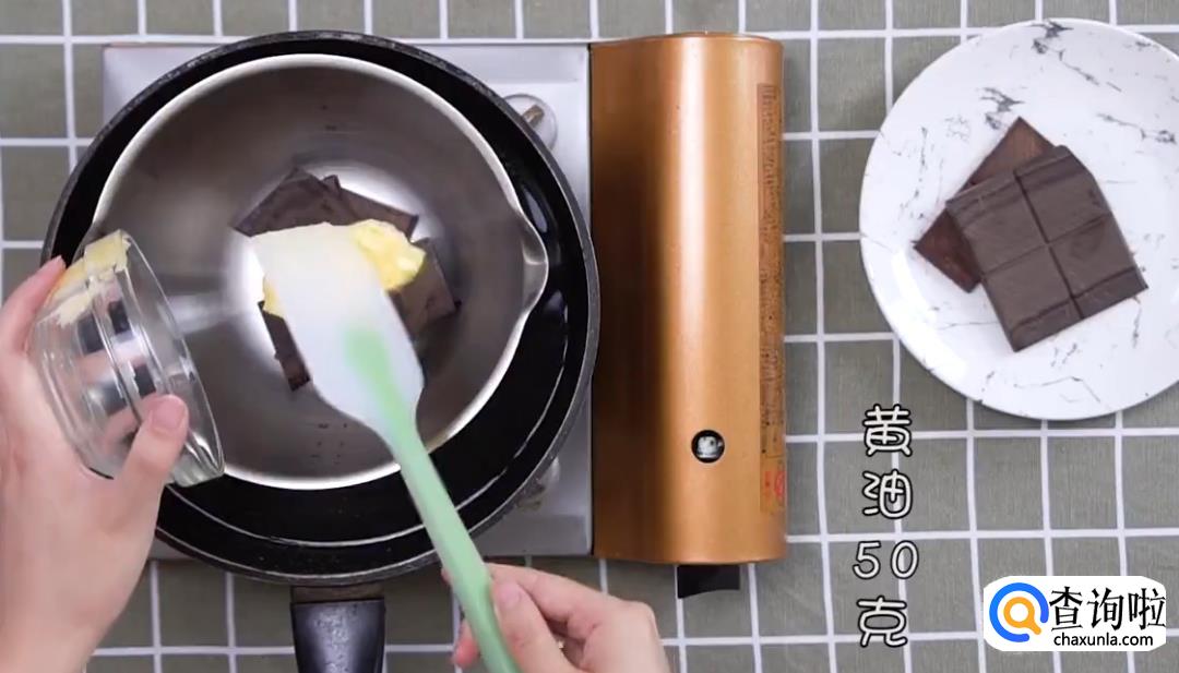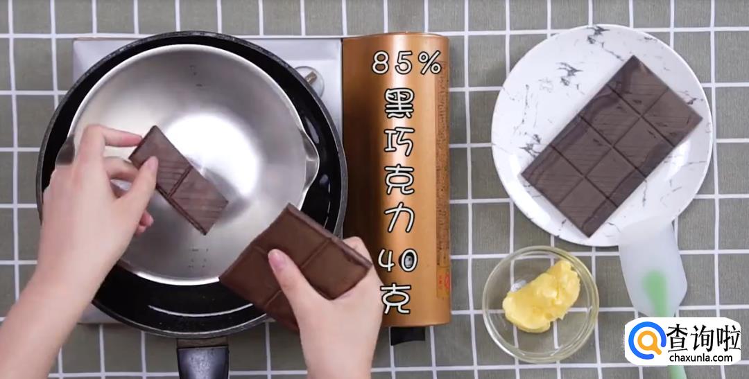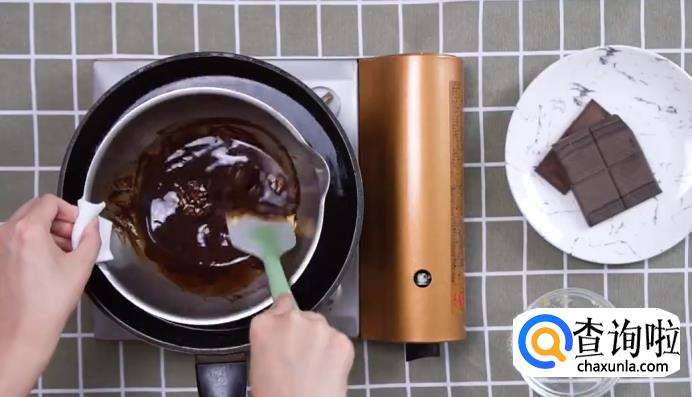 热水锅中放料理盆,放入85%黑巧克力40g,黄油50g搅拌成巧克力酱。