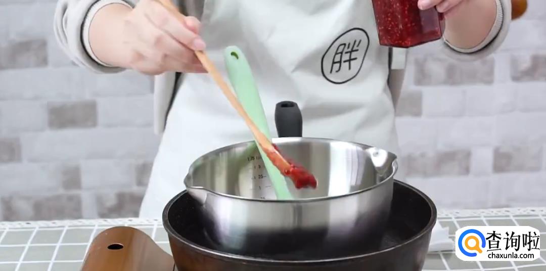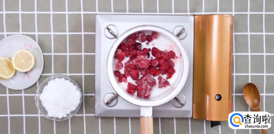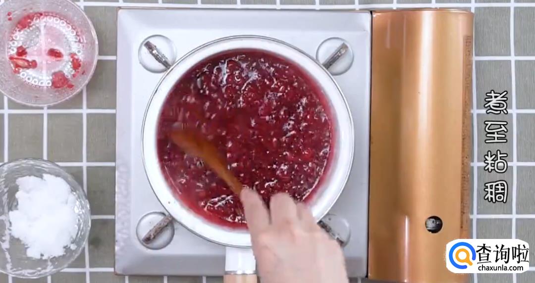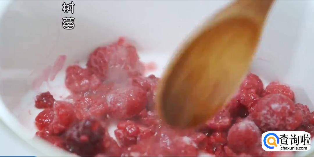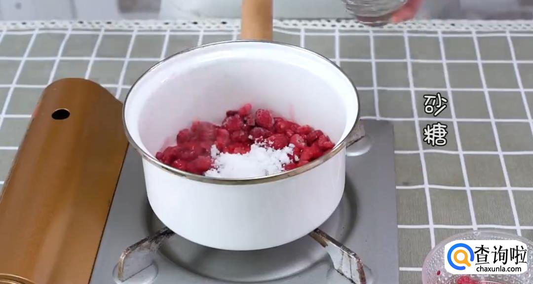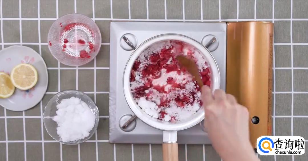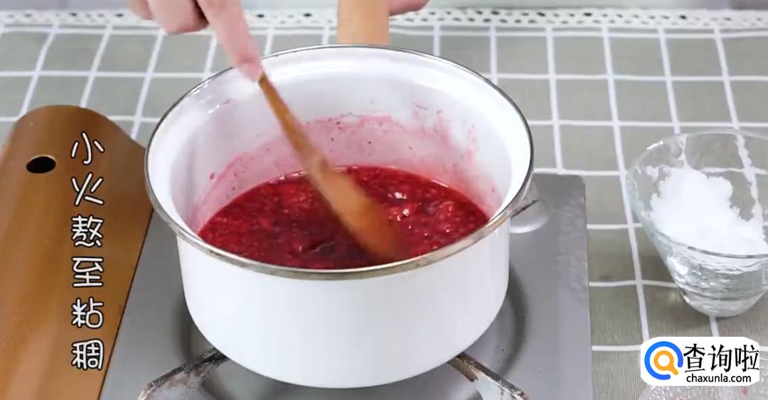 将树莓和少量水倒入锅中搅拌,倒入大量白砂糖,开小火搅拌成树莓酱。