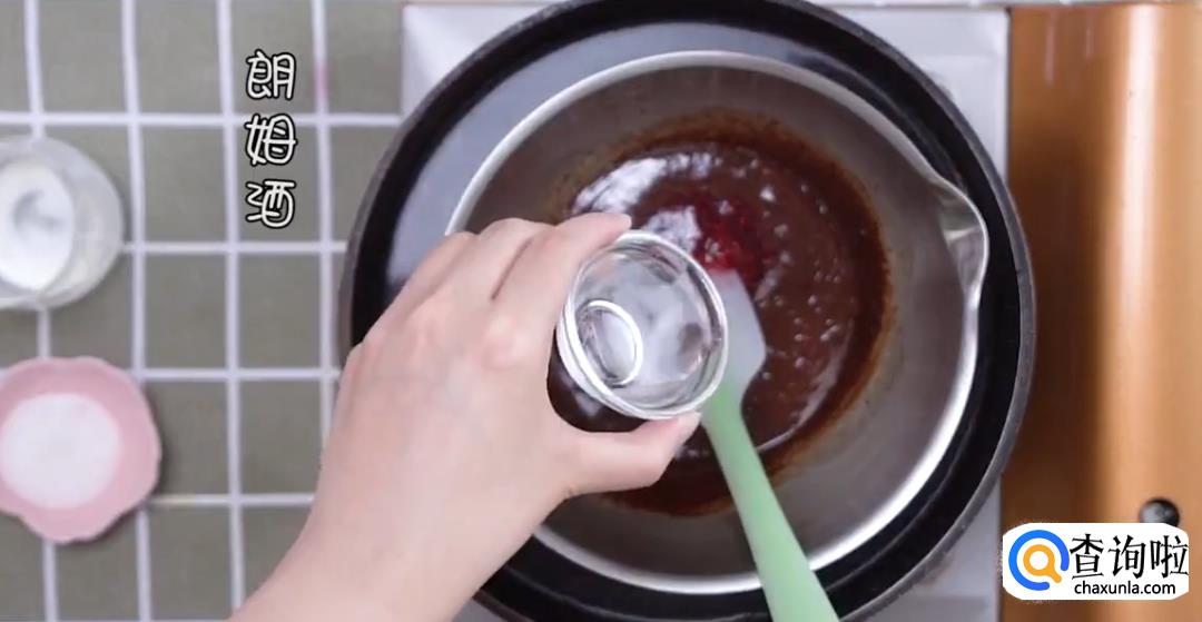 加入树莓酱和少量盐,倒入朗姆酒,再次搅拌,巧克力夹心酱就做好了,放入冰箱冷藏。