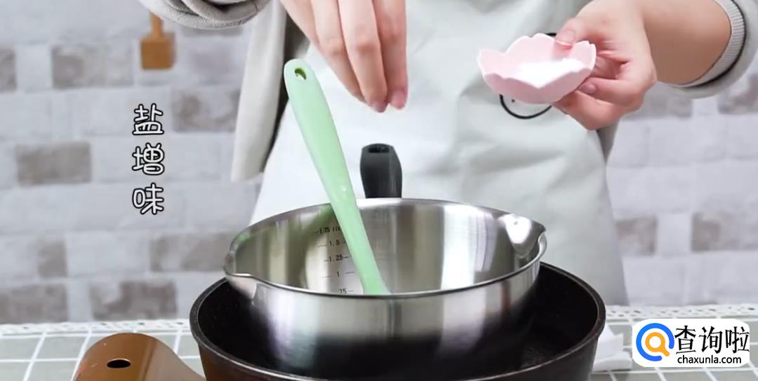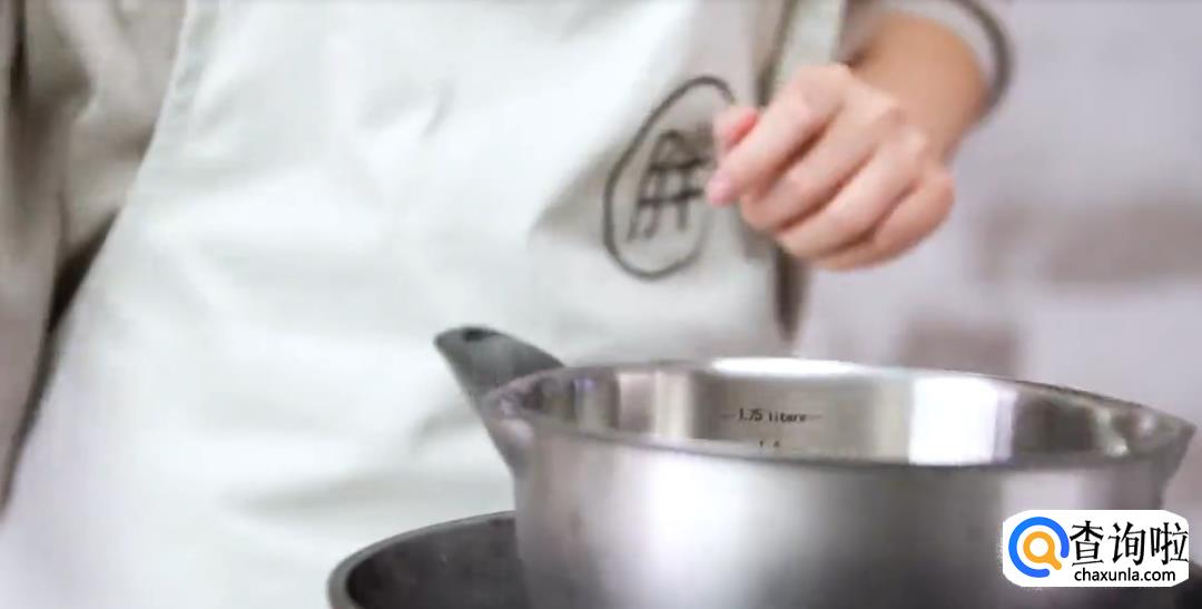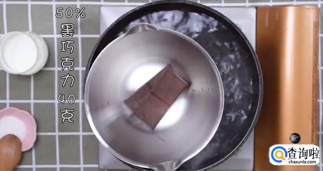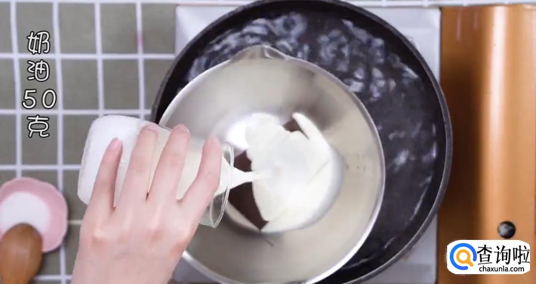 热水锅中放料理盆,加入50%黑巧克力40g和淡奶油50g,搅拌成液体状。