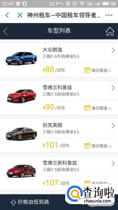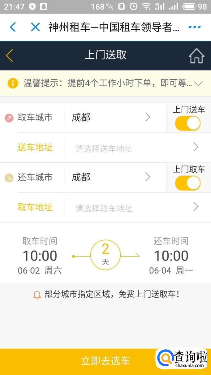 进入应用之后确认租车的城市门店以及时间,点击“立即去选车”