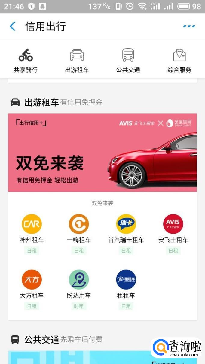 打开支付宝APP,然后在芝麻信用中找到信用出行,在出游租车中选择一个品牌进入。