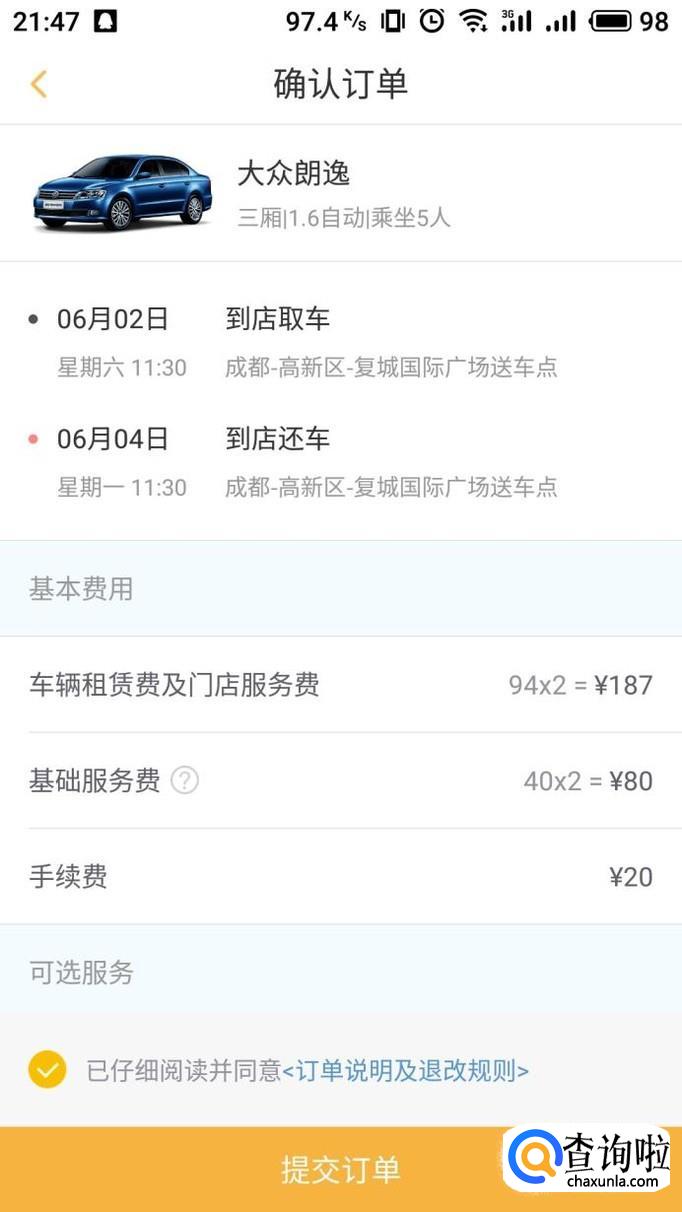 进入订单界面之后,查看订单信息,确定租车后完成之后即可。