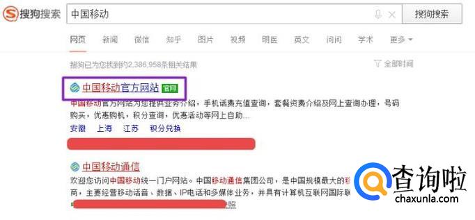 首先,我们点击打开我们电脑上面的浏览器,然后在搜索引擎中输入中国移动,弹出的界面,我们点击中国移动官方网站;