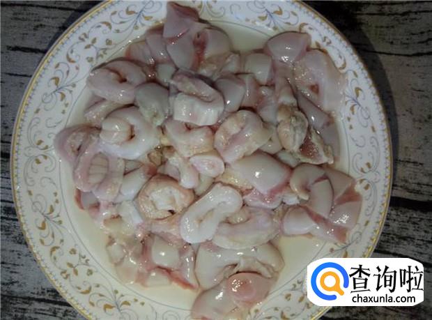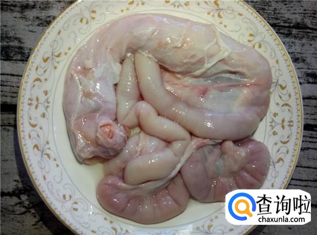 猪生肠加盐搓洗一边,再加生粉搓洗一边,把生肠上的白色东西给撕干净。