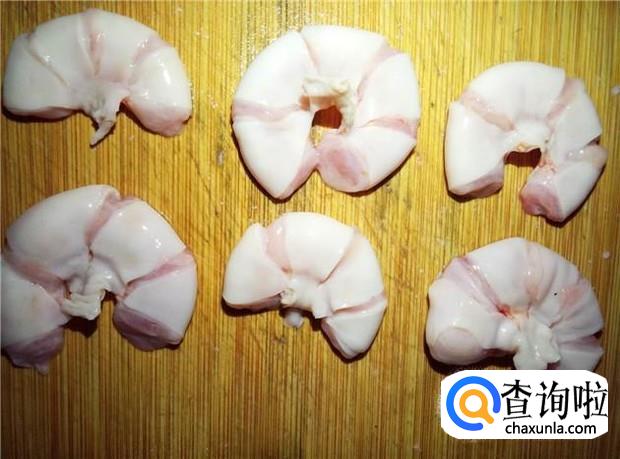烫过的生肠比较好切,切成花的形状,这样比较好入味,生肠比较大的那一端,要切小小块,要不很难嚼得烂。切好的生肠再用盐搓洗两遍。