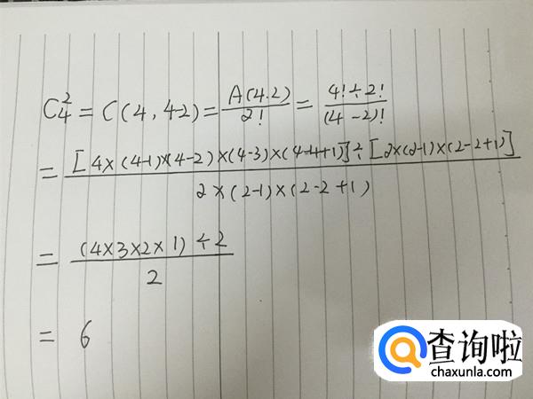 解:C(4,2)=A(4,2)/2!={[4x(4-1)x(4-2)x(4-3)x(4-4+1)]/[2x(2-1)x(2-2+1)]}/[2x(2-1)x(2-2+1)]=[(4x3x2x1)/2]/2=6。