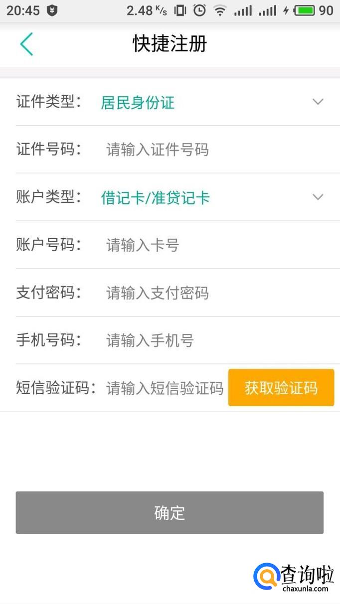 进入快速注册界面,填写相关的信息进行验证之后即可成功开通手机银行。