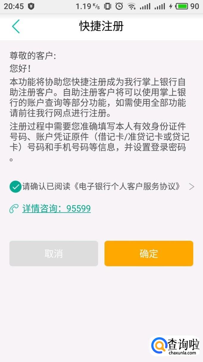 如果你有卡的话,点击“有农行卡,立即注册”进入,阅读相关提示信息,点击“确定”