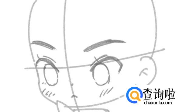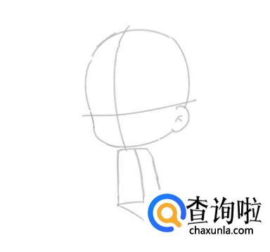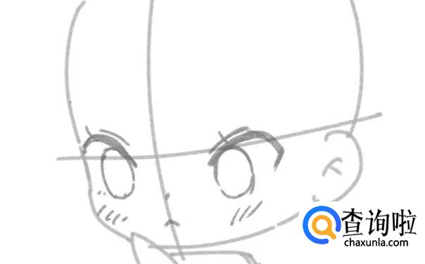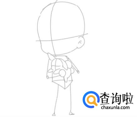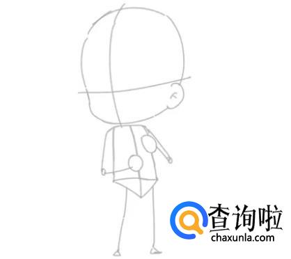 先用圆形和矩形确定人体躯干的姿态,二头身的身体占头部的一半长度。用十字线确定人物的透视。