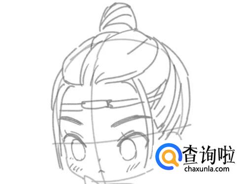 沿着十字线,画出眼睛,为了和欢乐的魏无羡互补,我们用沉稳的表情来画蓝忘机。 注意:让眼睛的轮廓扁平一些,可以使人物更冷俊。