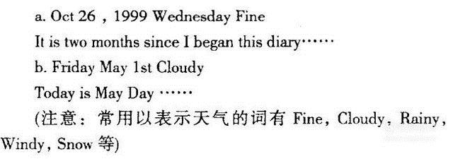 开头部分一般都是先写明日期,日期有年月日、月日年这两种方式进行抒写;接着在写明当天的天气情况,有Sunny,Fine,Rainy,Windy等;接着关于星期几的话,我们可以写,也可以不写。