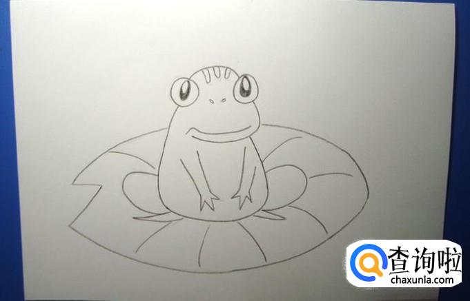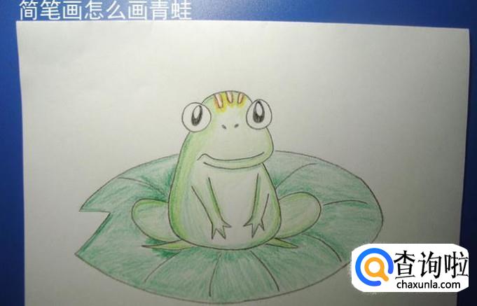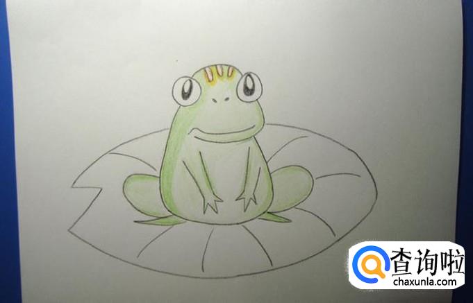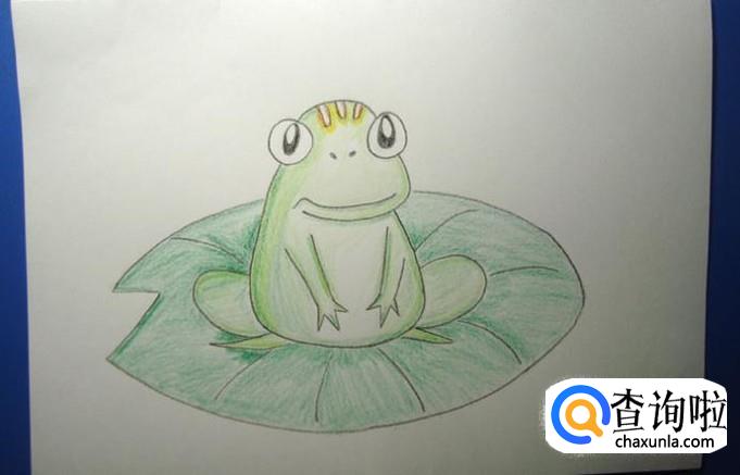 最后,用绿色彩铅笔给荷叶图形涂上颜色,如下图所示。这样简笔画青蛙就画好了,大家也来画画吧。