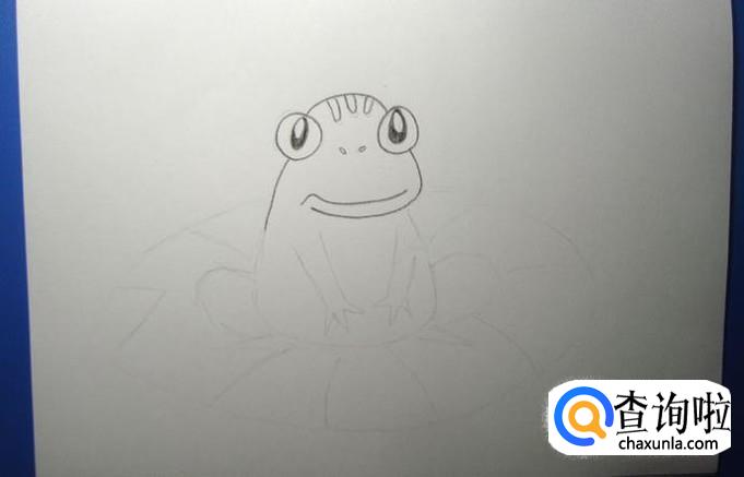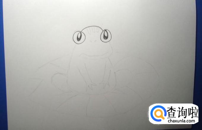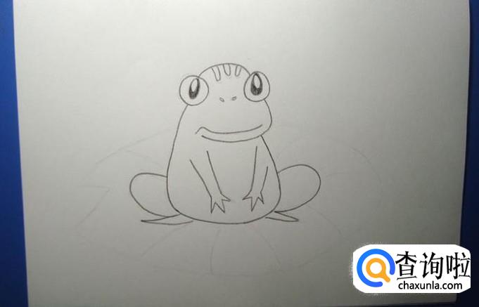 用铅笔在纸上绘制出青蛙图形的草图,并用黑色彩铅笔画出青蛙的眼睛图形,如下图所示。