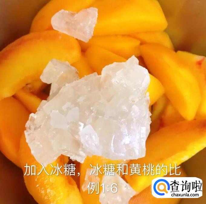 接着往锅中加入冰糖(冰糖和黄桃的比例是1:6),如下图所示。