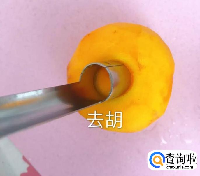 接着用去胡器把黄桃的胡去掉,如下图所示。