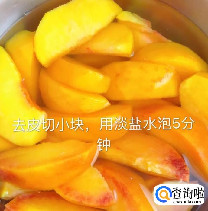 然后把黄桃切成小块,用淡盐水浸泡5分钟,如下图所示。