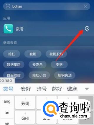 输入“拨号”后,搜索栏下方会出现拨号的图标及一个定位键,点击这个定位键。