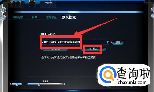 最后一步就是对【默认格式】的设置了,设置为【24位,96000HZ(专业录音室音质)】,点击【DVD格式】,这样对Realtek高清晰音频管理器的设置就完成啦,你可以去试试听一下,看看是不是更震撼了呢。