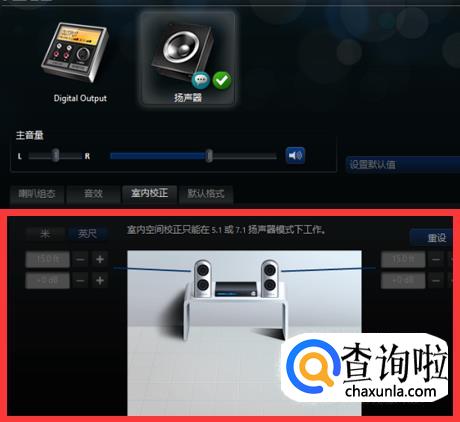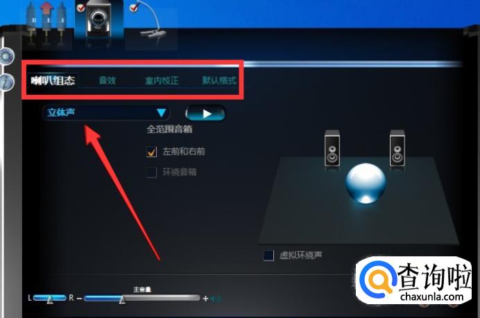 进入【Realtek高清晰音频管理器界面】后,对【扬声器】进行设置就可以了,下面就可以看到,可以设置【喇叭组态】、【音效】、【室内校正】和【默认格式】四个方面。