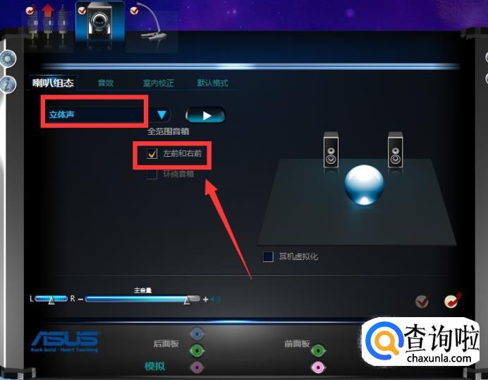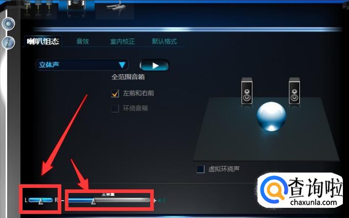 接下来就可以设置【喇叭组态】啦,【主音量】设置到居中位置就可以了,音量就根据你实际情况进行设置,设置为【立体声】,然后勾选【左前和右前】,如果是用耳机的,也可以勾选【耳机虚拟化】哦。