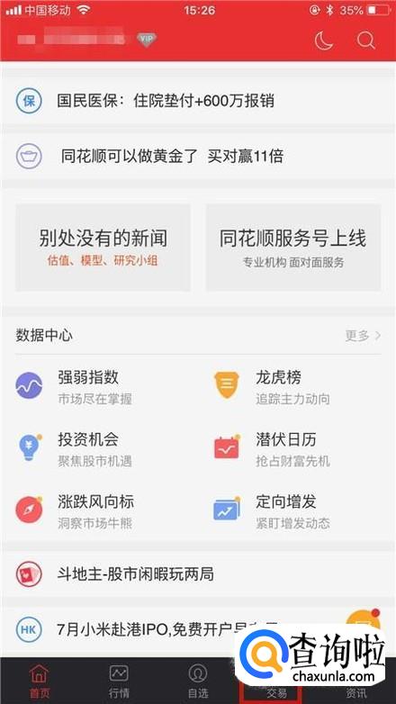 然后点击屏幕右下方的交易,如下图所示。