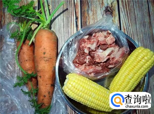 准备好所有材料:猪骨头、玉米两根、红萝卜两根。