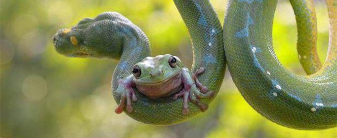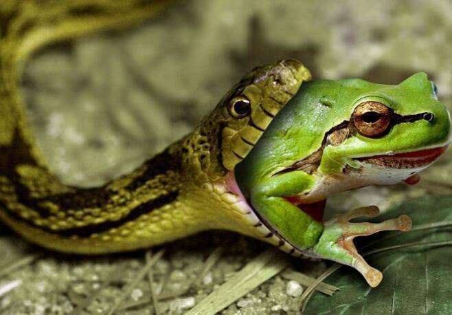 为什么青蛙会跳到蛇的嘴里呢?那是因为青蛙的眼睛善于看闪动的东西,不善于看静止不动的东西,青蛙误认为蛇的舌头是飞虫,青蛙就跳起来捕食,正好跳进蛇的嘴里了。