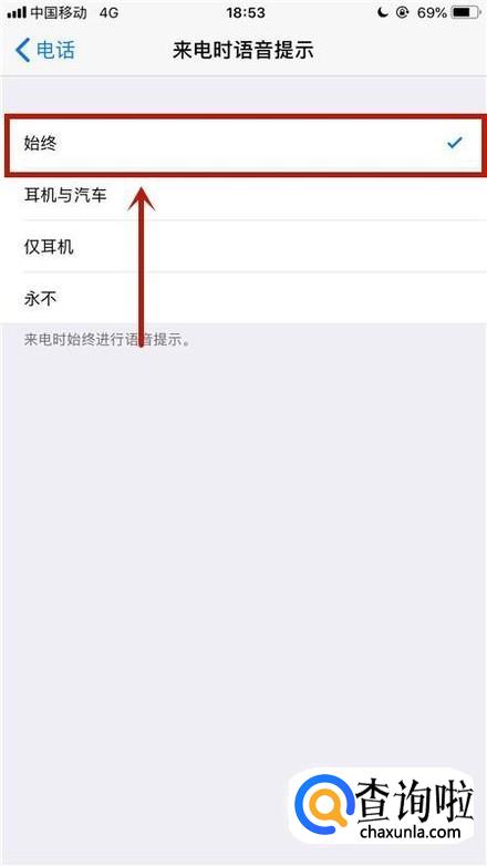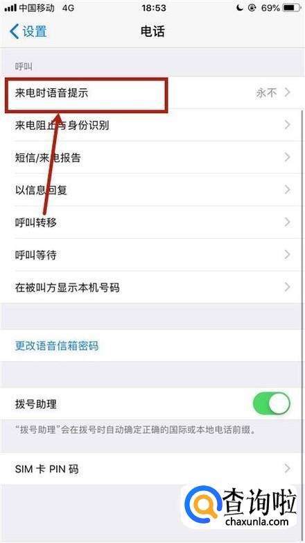 接着点击来电时语音提示,如下图所示。