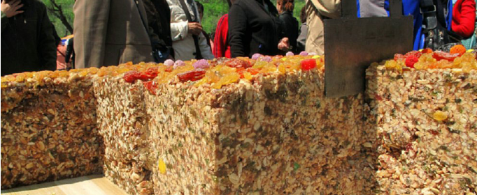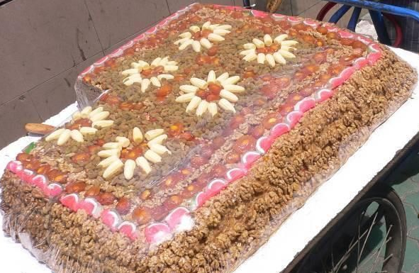 切糕是玛仁糖的俗称,是一种新疆南疆维吾尔族人民采用传统特色工艺,选用核桃仁、玉米饴、葡萄干、葡萄汁、芝麻、玫瑰花、巴丹杏、枣等原料熬制而成的民族特色食品。因出售时一般用刀从大块玛仁糖切下小块,因此又被称作切糕。