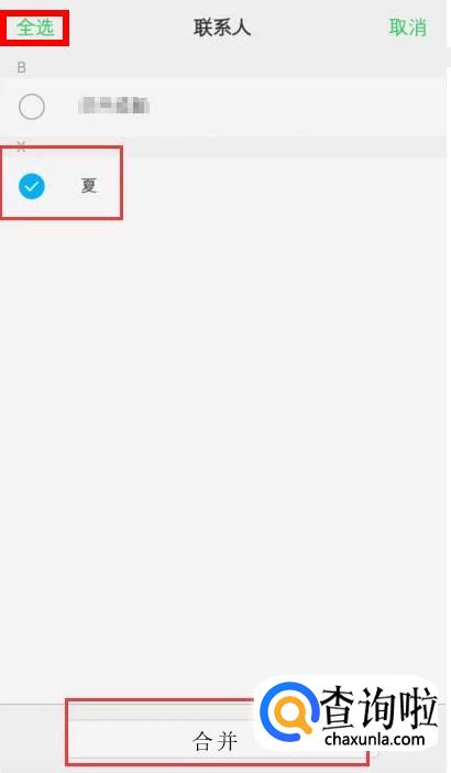 进入联系人去重页面后,会显示重复的联系人信息,点击左上角全选,在点击页面最下方中间的“合并”,手机就会自动合并重复联系人。