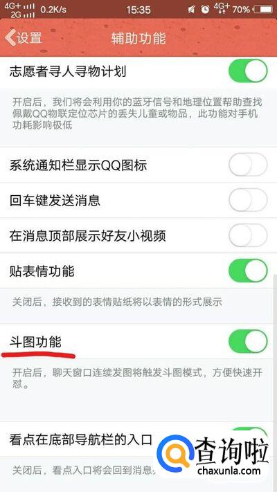 最后,我们手动找到“辅助功能”,并且点击它,将其中的“斗图功能”点击开启即可。