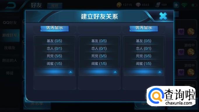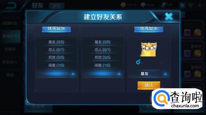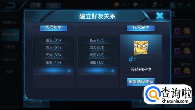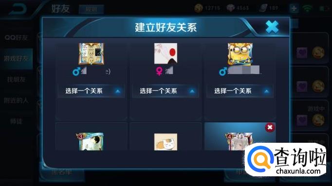 这里就可以看到满足建立亲密度关系的好友了,QQ好友和游戏好友均可,点击“选择一个关系”,选择基友。