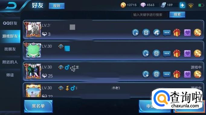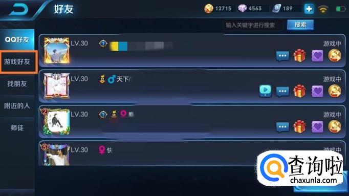 然后就能看到好友了,第一栏是QQ好友,就是QQ好友在这个游戏里面的角色,点击‘游戏好友‘,然后点击右下角的亲密度关系。