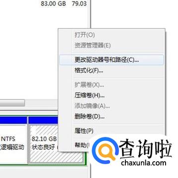 我们在“磁盘0”右边的无盘符分区上右键单击,在弹出的菜单里选“更改驱动器号和路径”。