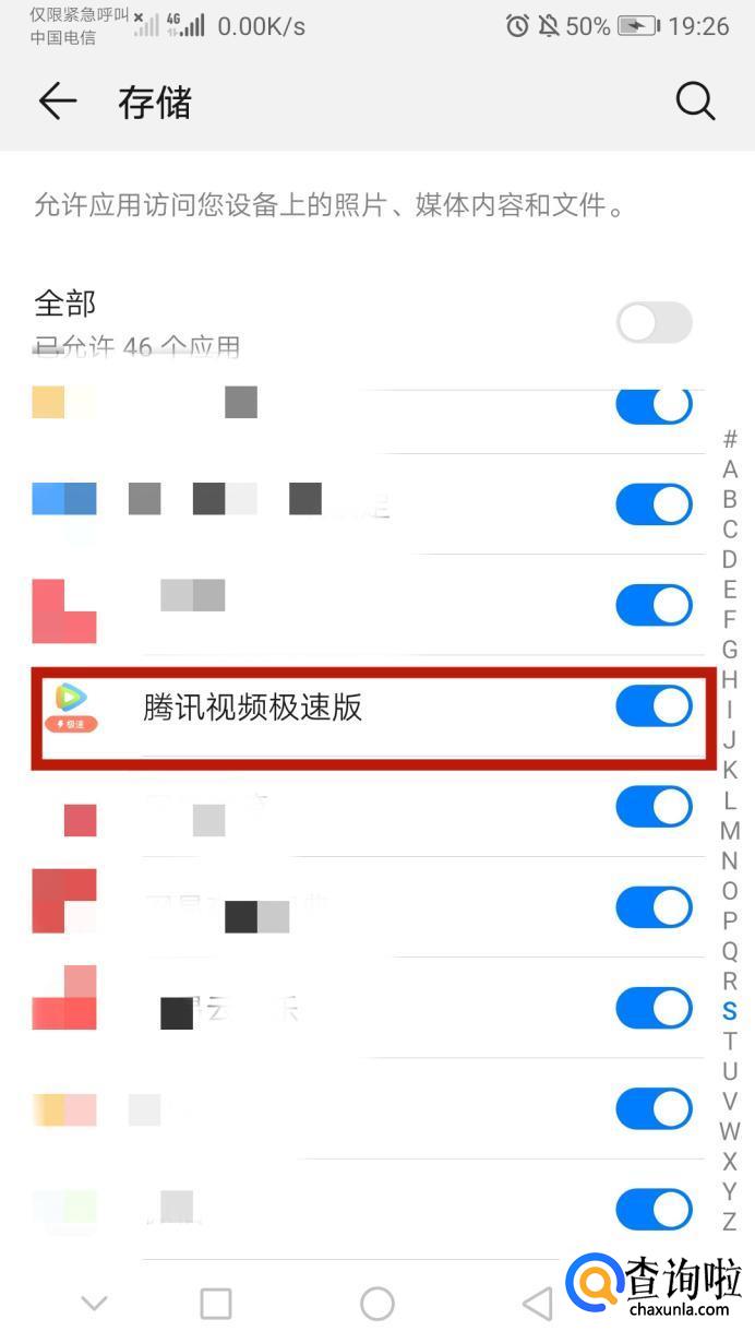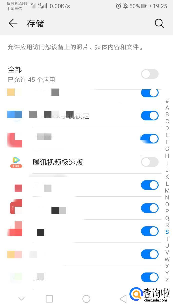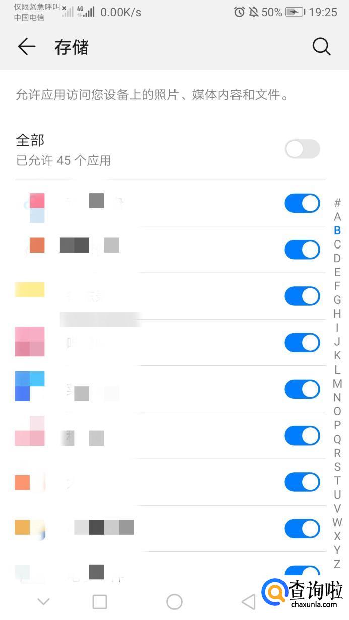 可以看到已经开启了存储权限的应用旁边的开关都是开启的,这个时候我们需要找到需要开启存储权限的应用。