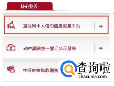 进入征信中心首页后,点击中间位置的核心业务“互联网个人信用信息服务平台”