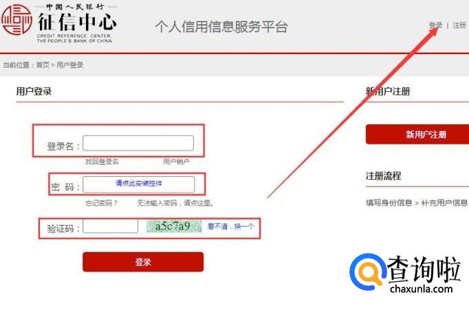 进入征信中心页面,点击右上角的“登录”,然后输入“登录名”“密码”和“验证码”,然后点击“登录”