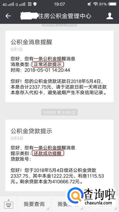 关注之后,每月公积金入账、还款日期及金额、正常还款等都会有提示,每月还款就方便多了,也不会忘记。每月还款提醒和成功还款提示如下图所示。