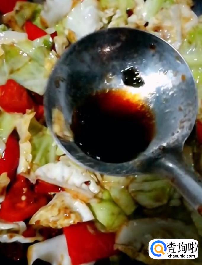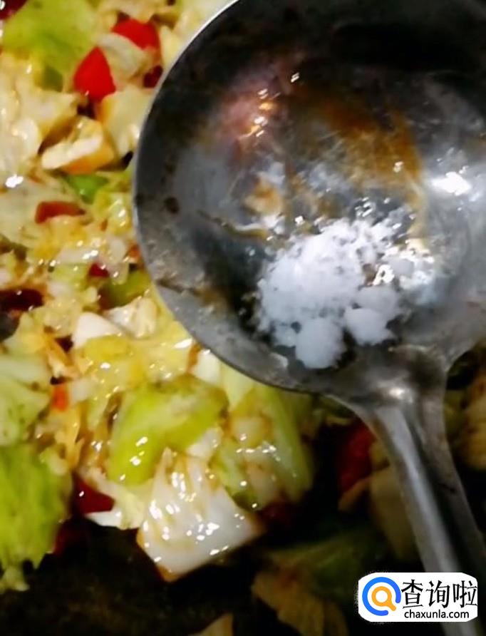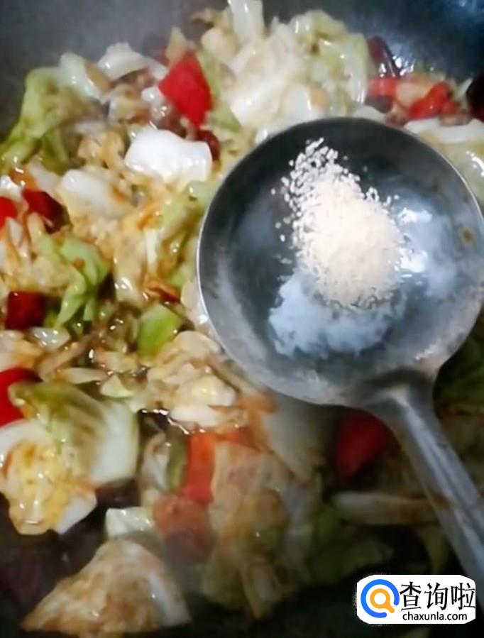 然后我们放入滑熟的包菜与红辣椒,放入适量的白糖提鲜