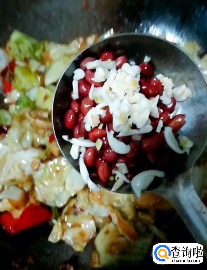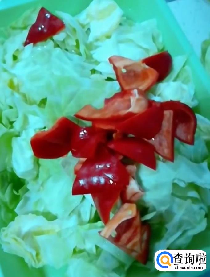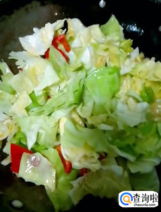 接着我们起锅烧油,油热下入包菜与红辣椒,滑熟捞出备用