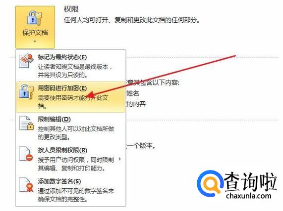 紧接着我们点击保护文档、用密码就行加密。如图。